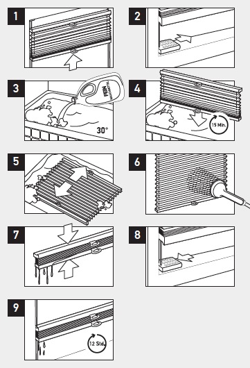 - Week de plissé/Duette® in bad in 30 graden warm water (handwarm) met zacht wasmiddel.